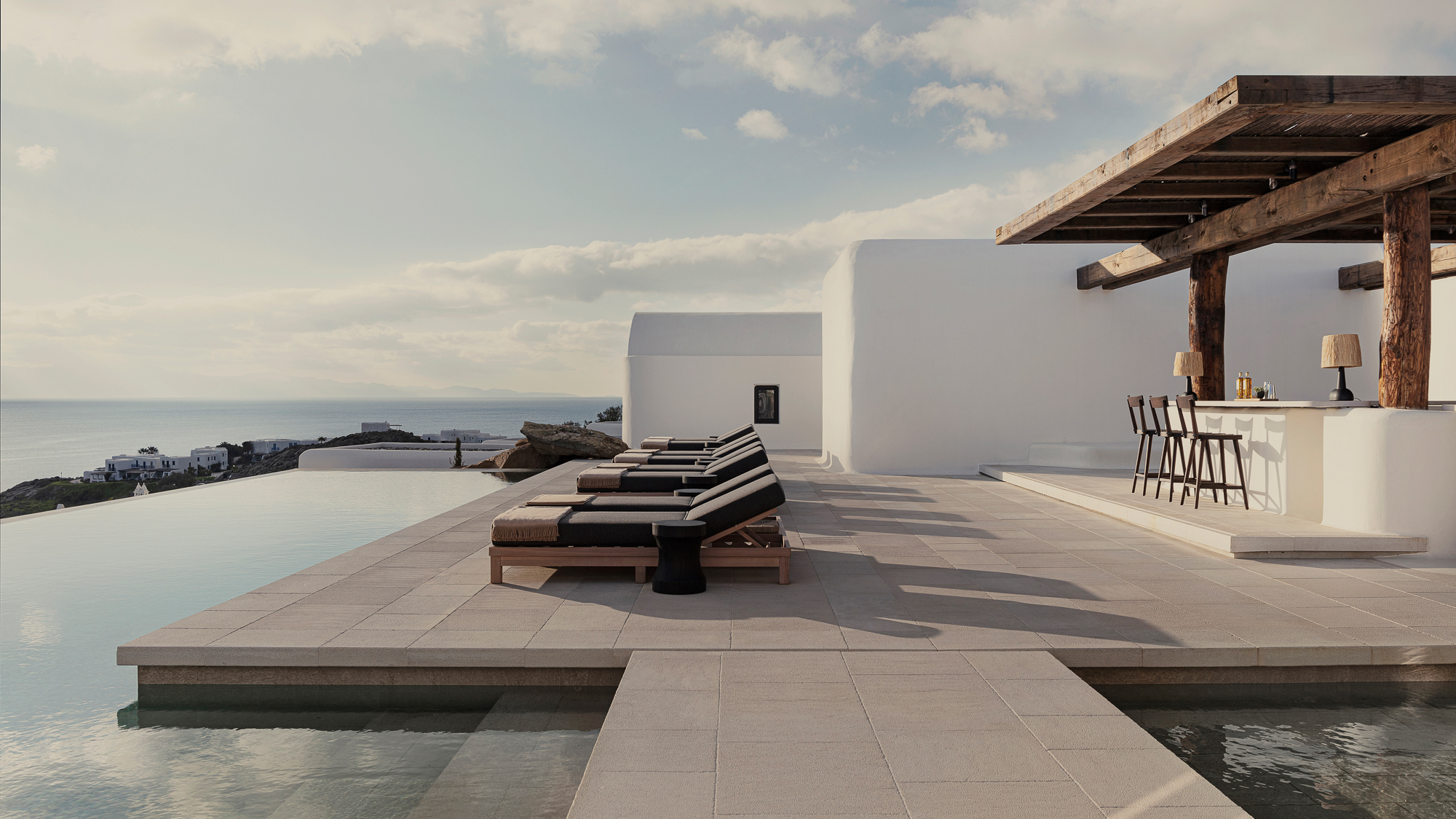 Designed by K-Studio, the property pairs sculptural minimalism with a laid-back rhythm that feels entirely its own. Guests arrive via a quiet path lined with volcanic stone and bursts of bougainvillea, before stepping into a reception where whitewashed walls meet wicker, cane, and art books that beg to be browsed. Local artworks hang casually, as if placed by a friend with exceptionally good taste. The atmosphere is relaxed but deliberate, where tradition isn’t preserved under glass but reimagined for now. Think Cycladic ease with a modern edit.